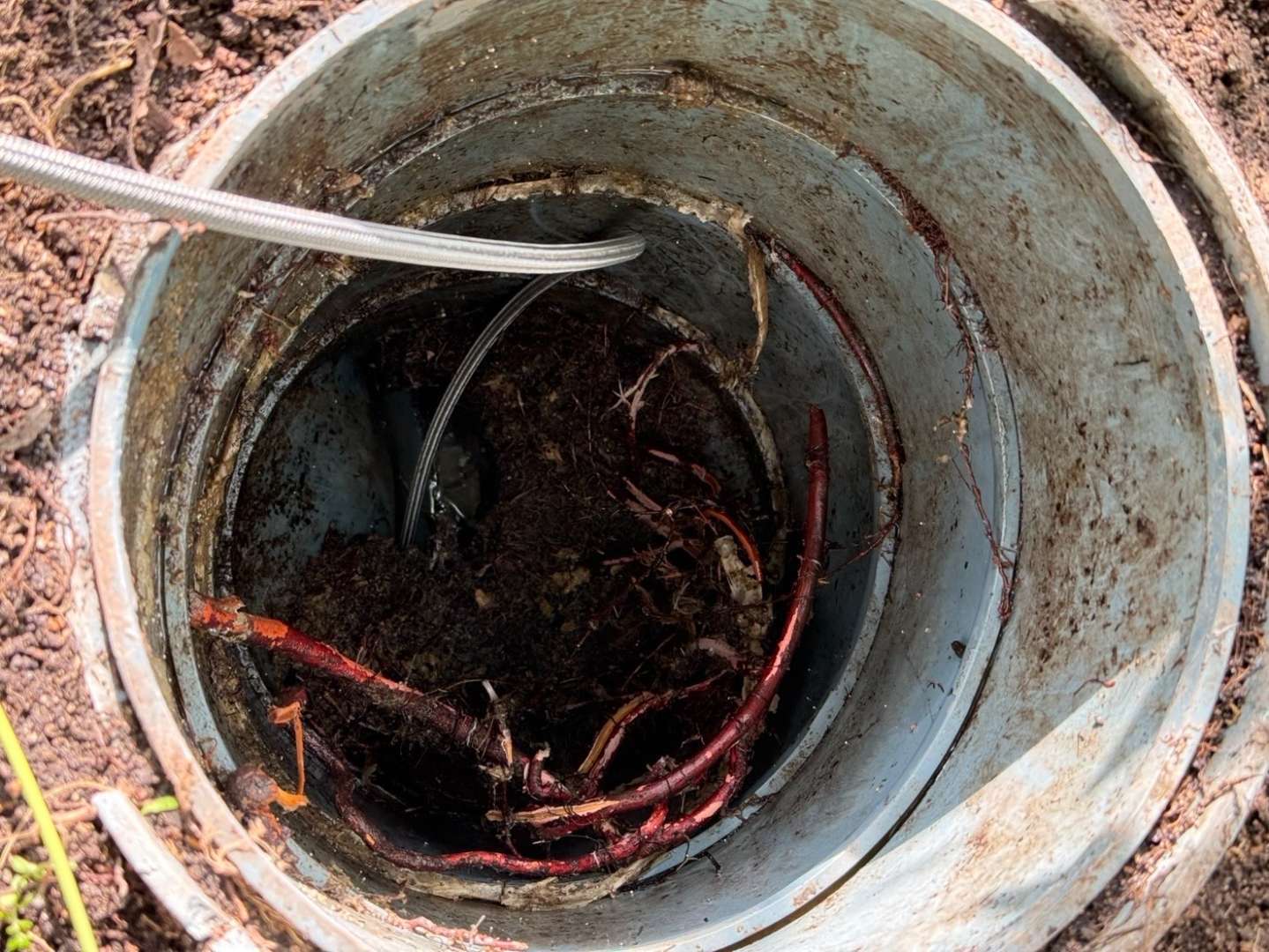 糸島市の住宅では、庭の排水が悪くなり調査したところ、排水管内部に泥が層になっていたことが判明しました。