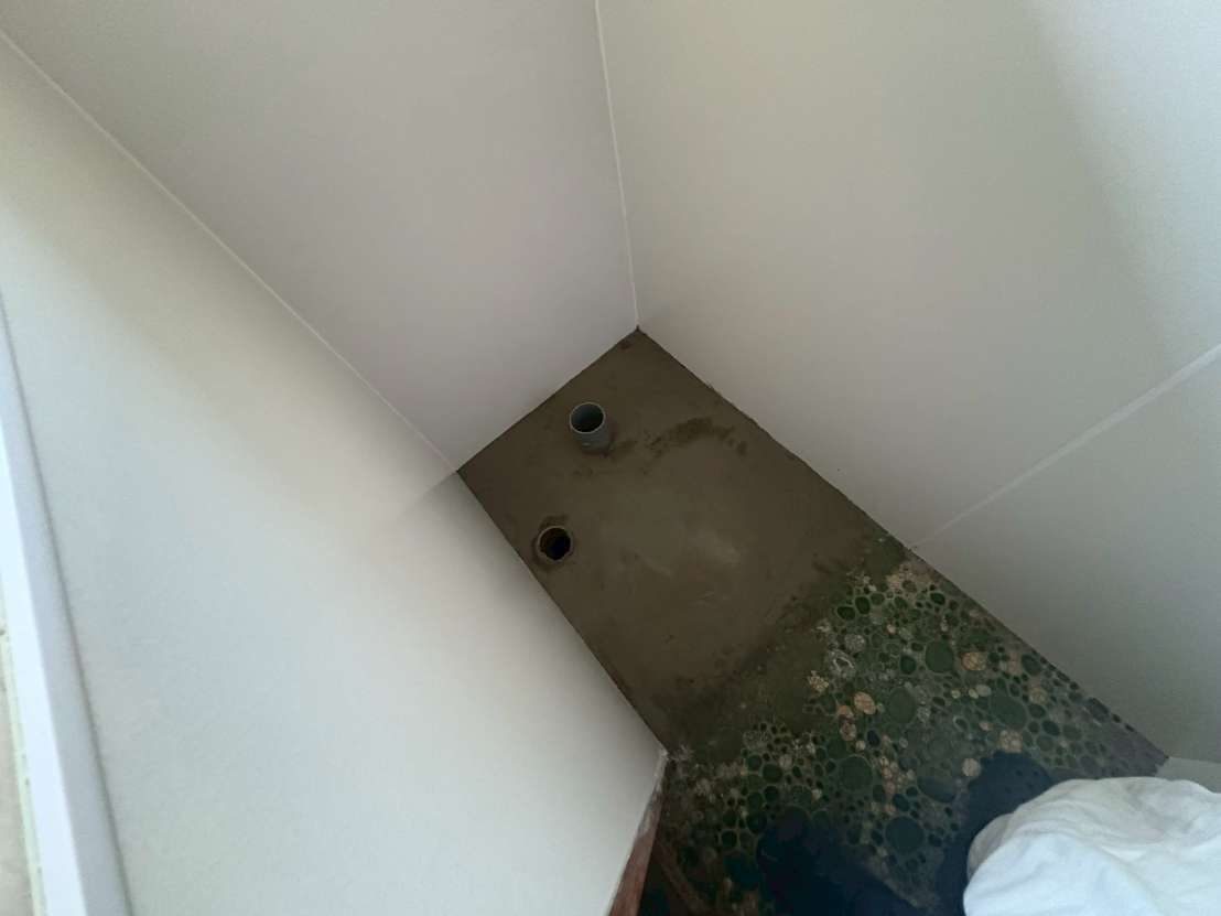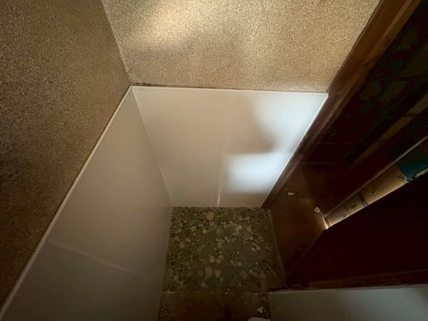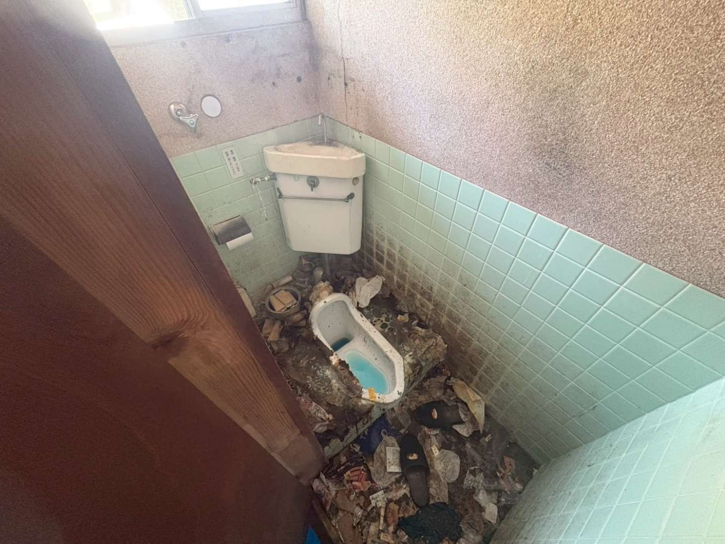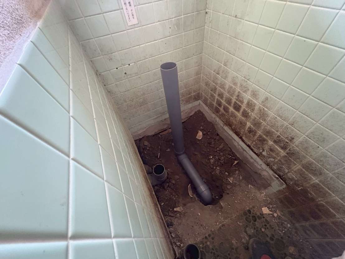 和式トイレ用の配管を洋式トイレ用へ切り替え、併せて簡易的な壁のリフォームと床の張り替え(クッションフロア仕上げ)を実施。