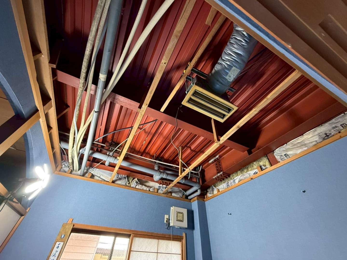 今回の工事は、以前洗管作業を行った際に発覚した漏水による被害に対応するもので、1階の天井張り替えに加え、関連するクロスの張り替えを実施。また、従来の在来式のお風呂を、メンテナンス性・断熱性に優れたユニットバスへ変更する内容となっています。