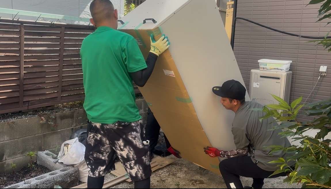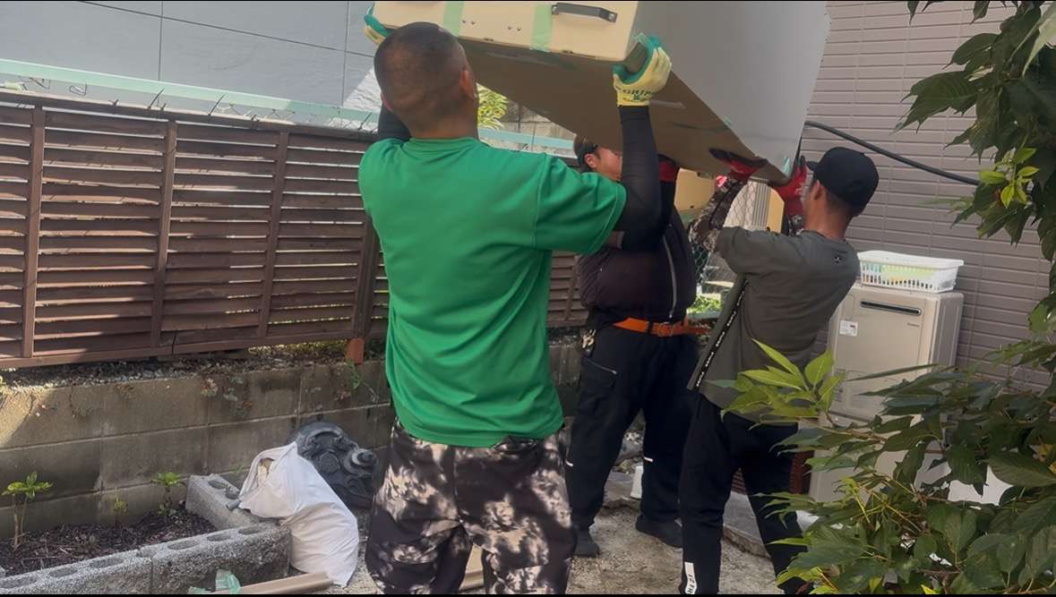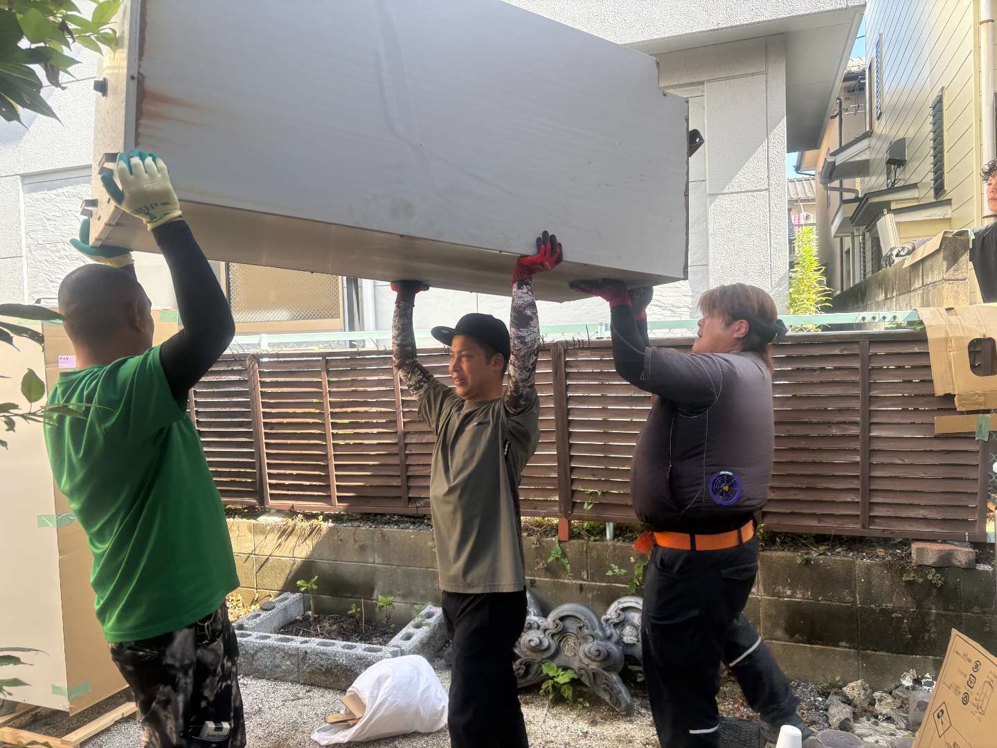 段の上がった柵付きのお宅でしたのでお隣の敷地をお借りして水道屋スマイリー一同集結で出し入れ致しました!